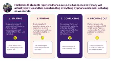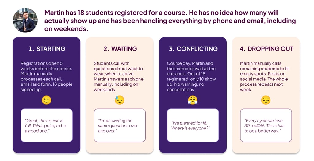 Every signup, cancellation, and reminder was handled manually by phone and email, including weekends. With no financial commitment from students, 30–40% simply didn't show up each cycle.