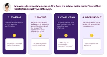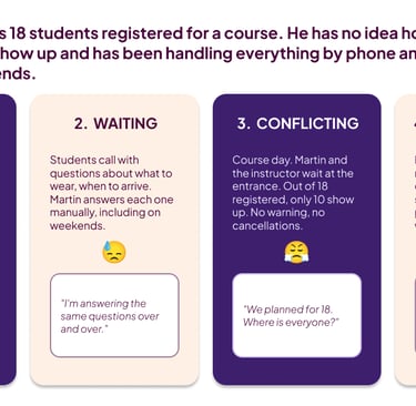 Due to the wide age range across different course types (18–75+), creating a single representative persona would have been misleading. Instead, I mapped two user journeys to capture the real pain points on both sides.